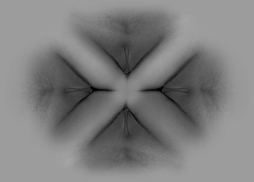 Ett abstrakt bildmontage i svartvitt av fyra ansade kvinnliga kön i form av en fyrklöver.