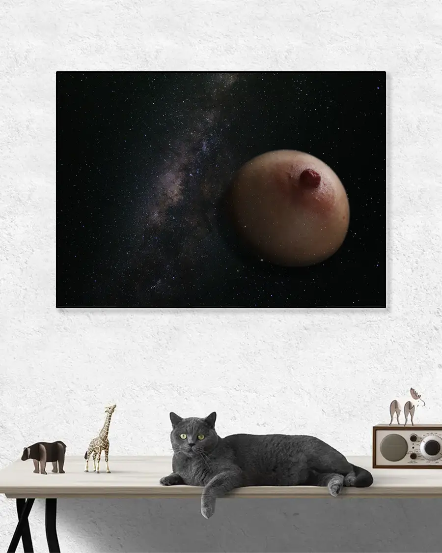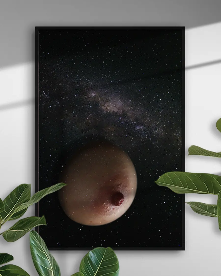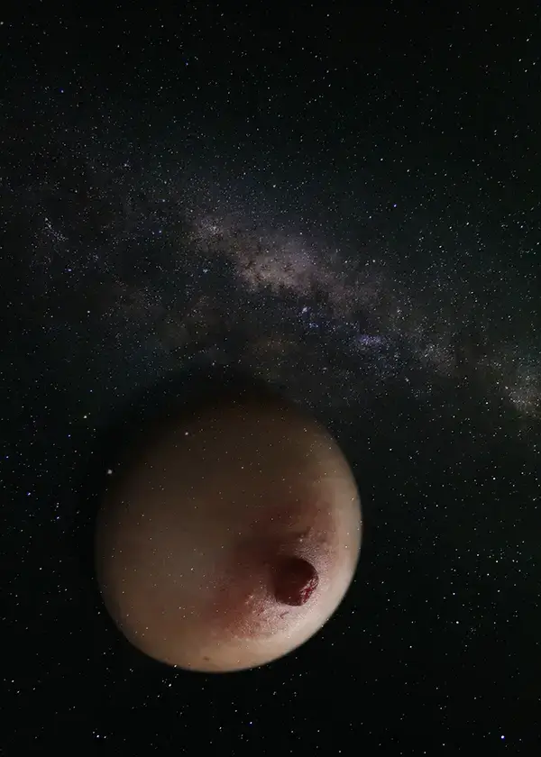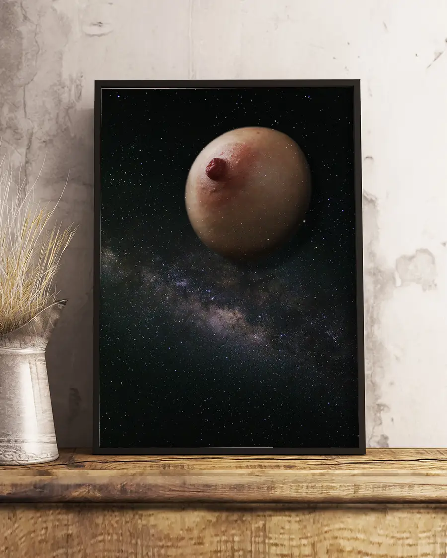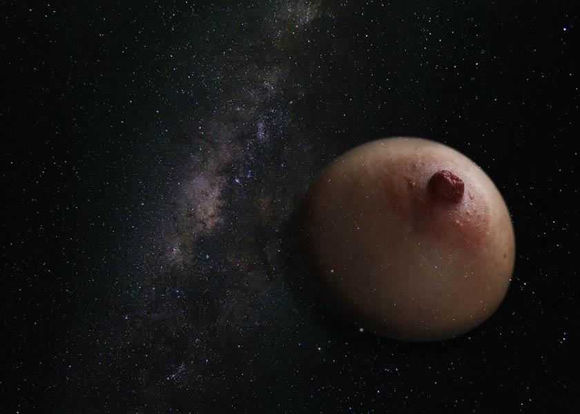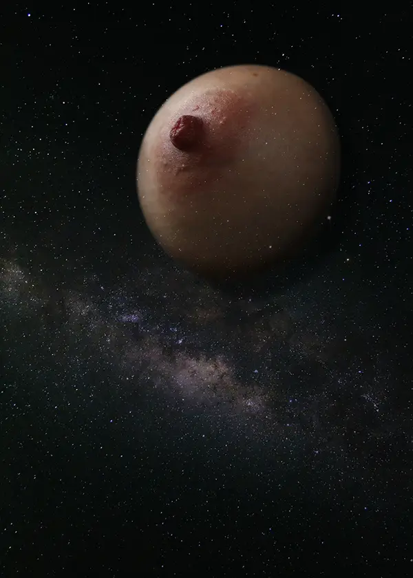 Med Vintergatan som bakgrund svävar ett kvinnligt bröst fritt som en planet.