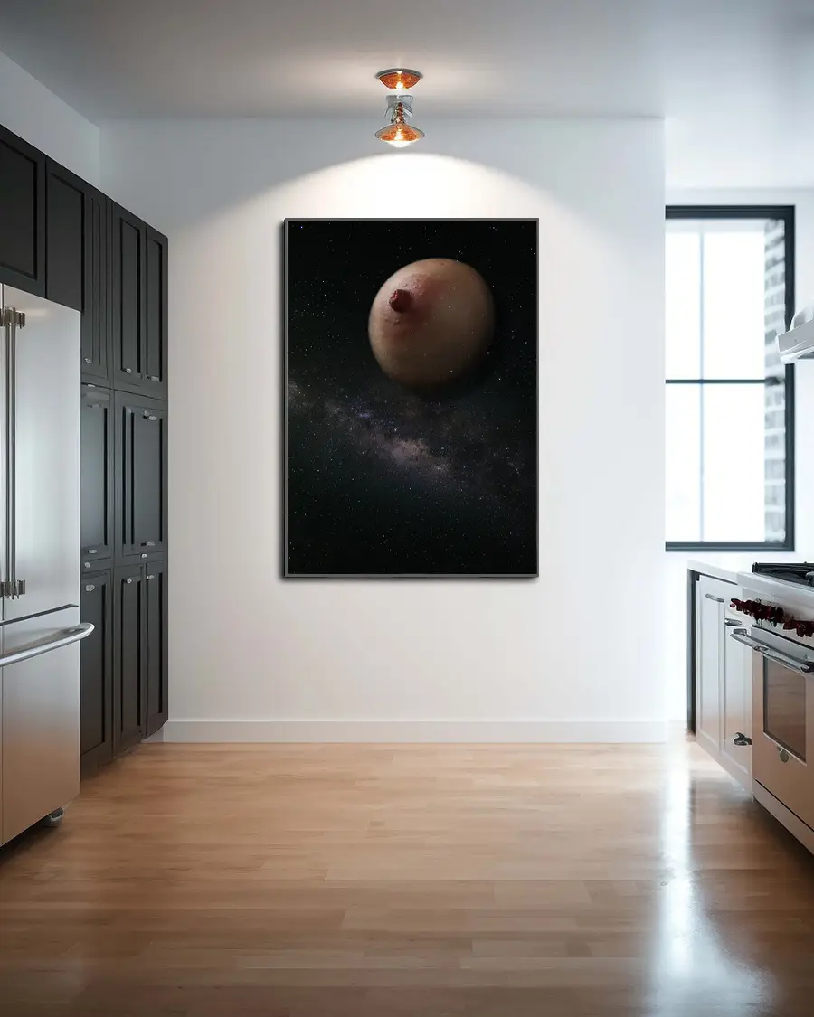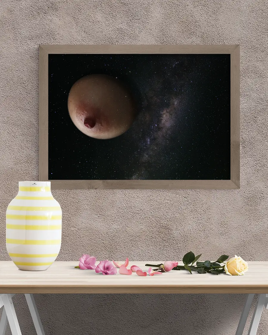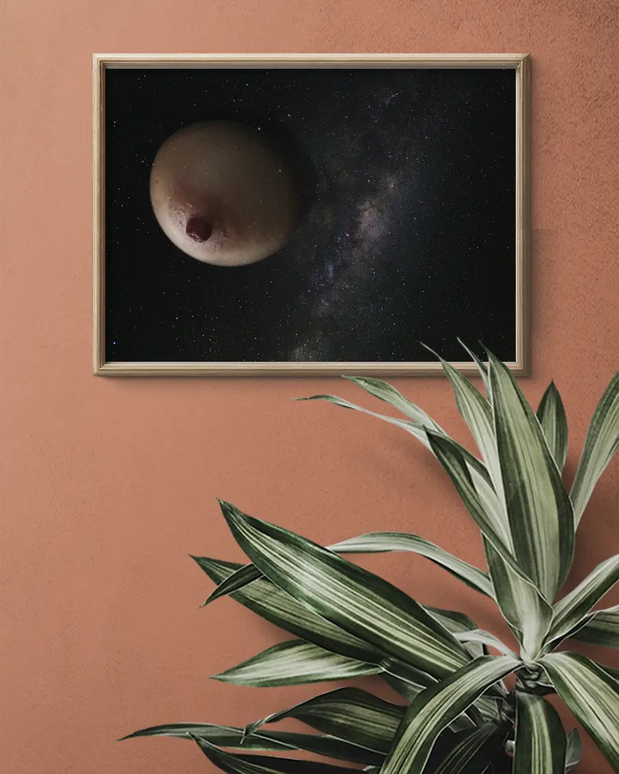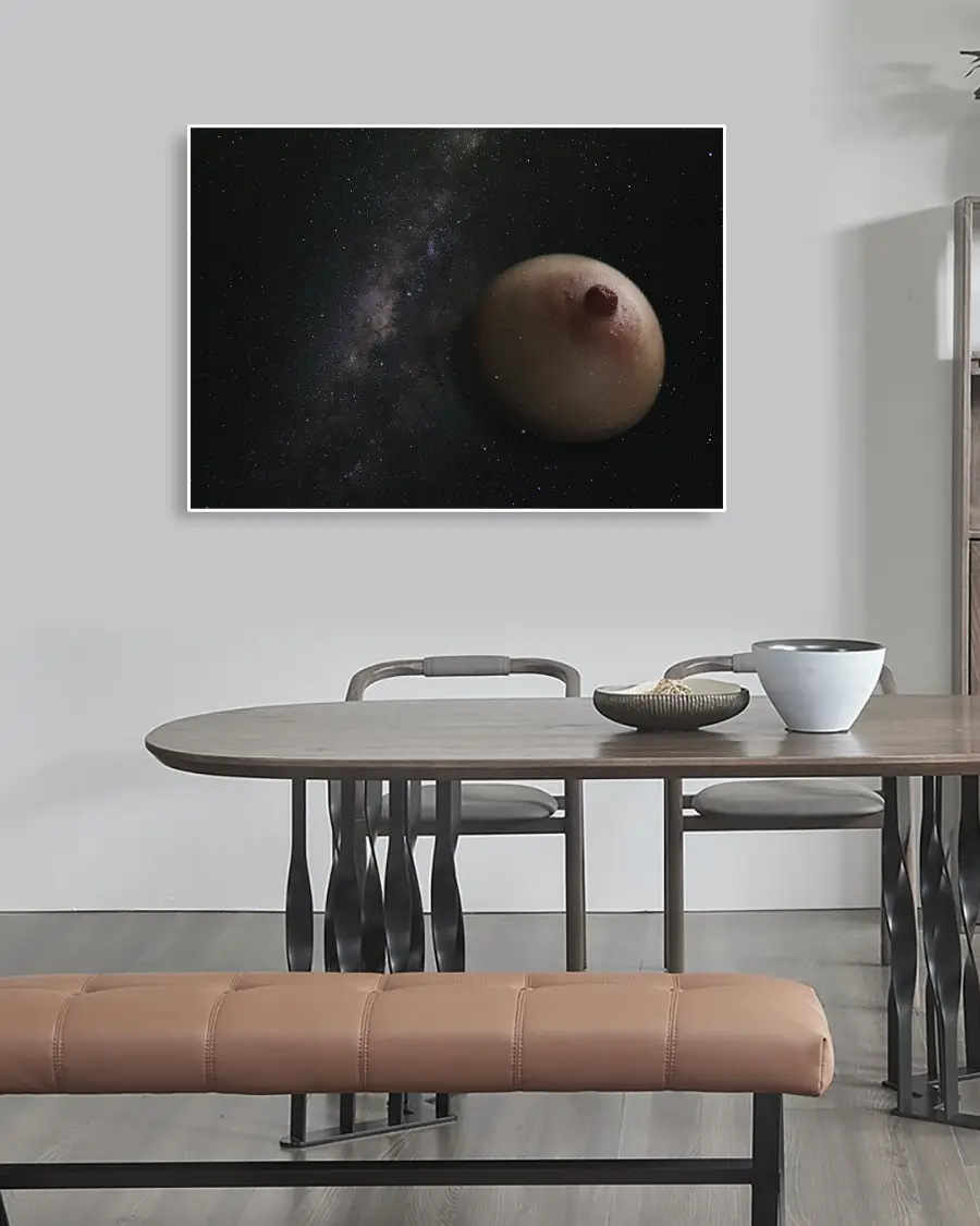 Med Vintergatan som bakgrund svävar ett kvinnligt bröst fritt som en planet.