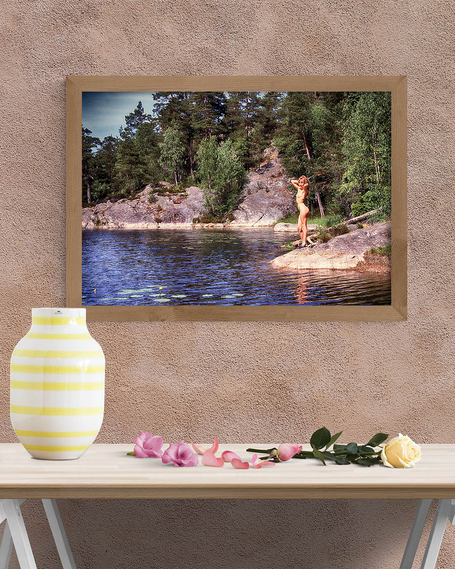 Ett stillsamt ögonblick fångat vid en insjö i Stockholmstrakten. På en solvarm klippa vid strandkanten står en kvinna naken i solen, omgiven av glittrande vatten och sommarens ljus. Bilden bär på en känsla av frihet, närhet till naturen och den avkopplade enkelhet som bara en svensk sommardag kan förmedla.