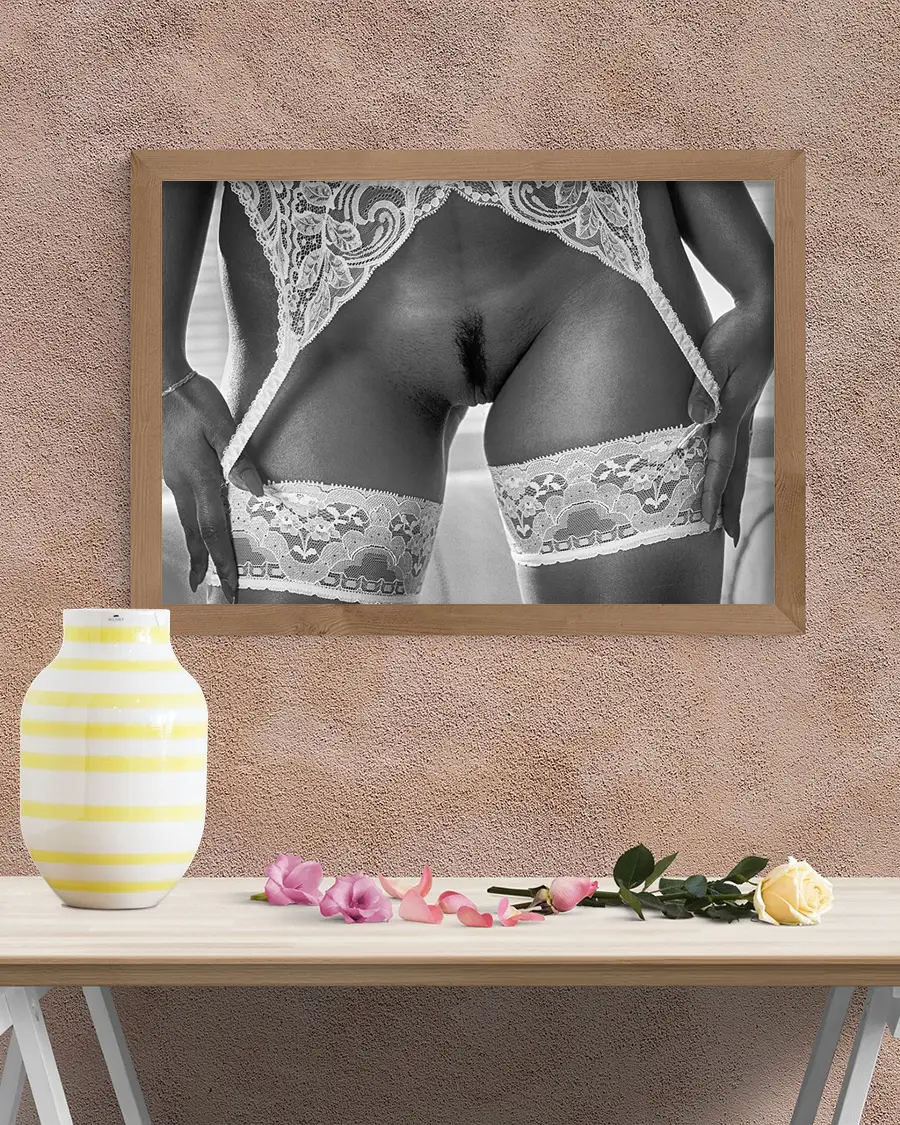 Hennes händer med långa naglar ramar in den intima silhuetten, medan en smal strimma sparat hår ger bilden ett naturligt uttryck. Den mörka huden kontrasterar vackert mot den ljusa bakgrunden och framhäver fotografiets sensuella elegans.