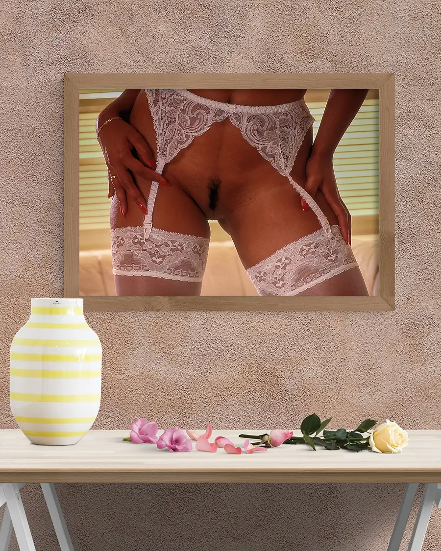 Hennes händer med långa röda naglar ramar in den intima silhuetten, medan en smal strimma sparat hår ger bilden ett naturligt uttryck. Den mörka huden kontrasterar vackert mot den ljusa bakgrunden och framhäver fotografiets sensuella elegans.