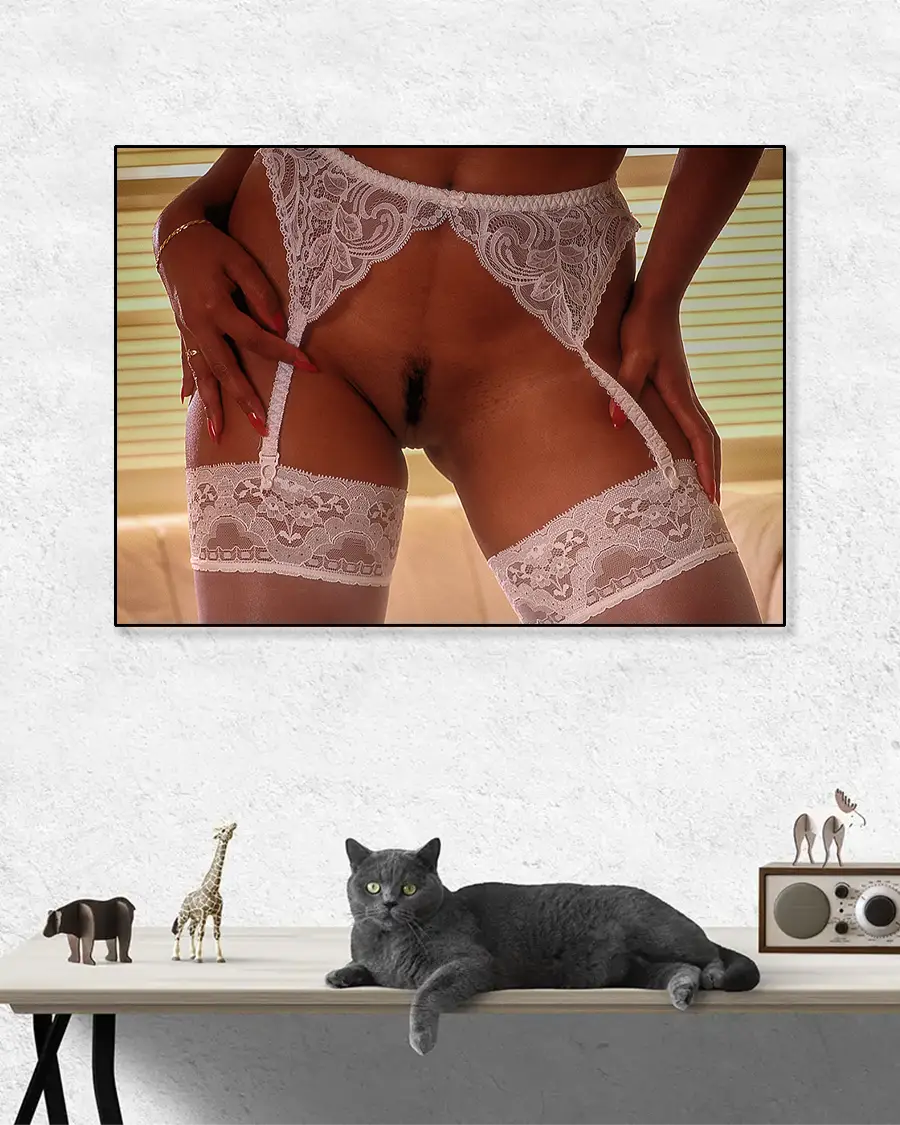 En stilren närbild av en naken kvinna endast iklädd en vit höfthållare och vita strumpor. Hennes händer med långa röda naglar ramar in det välansade könet med en smal sträng av könshåret sparat.