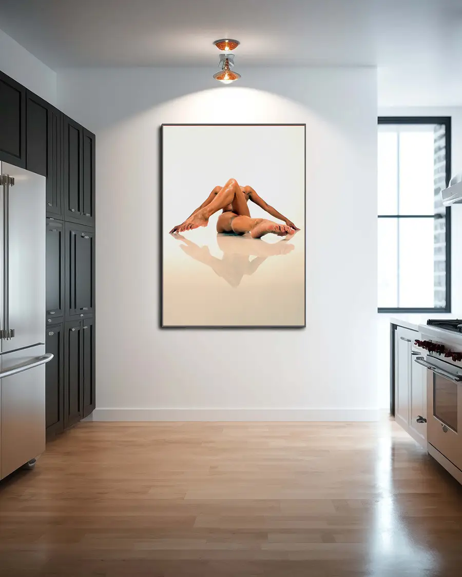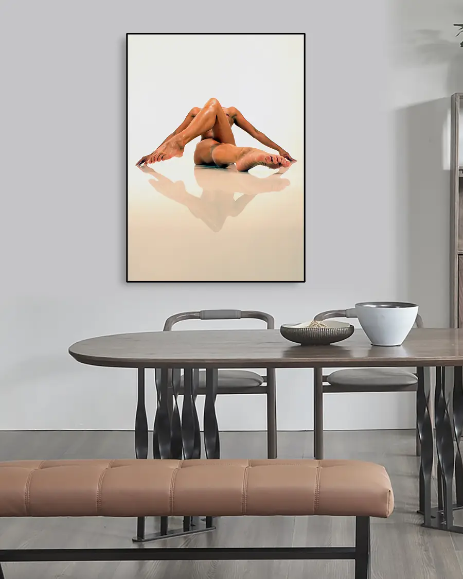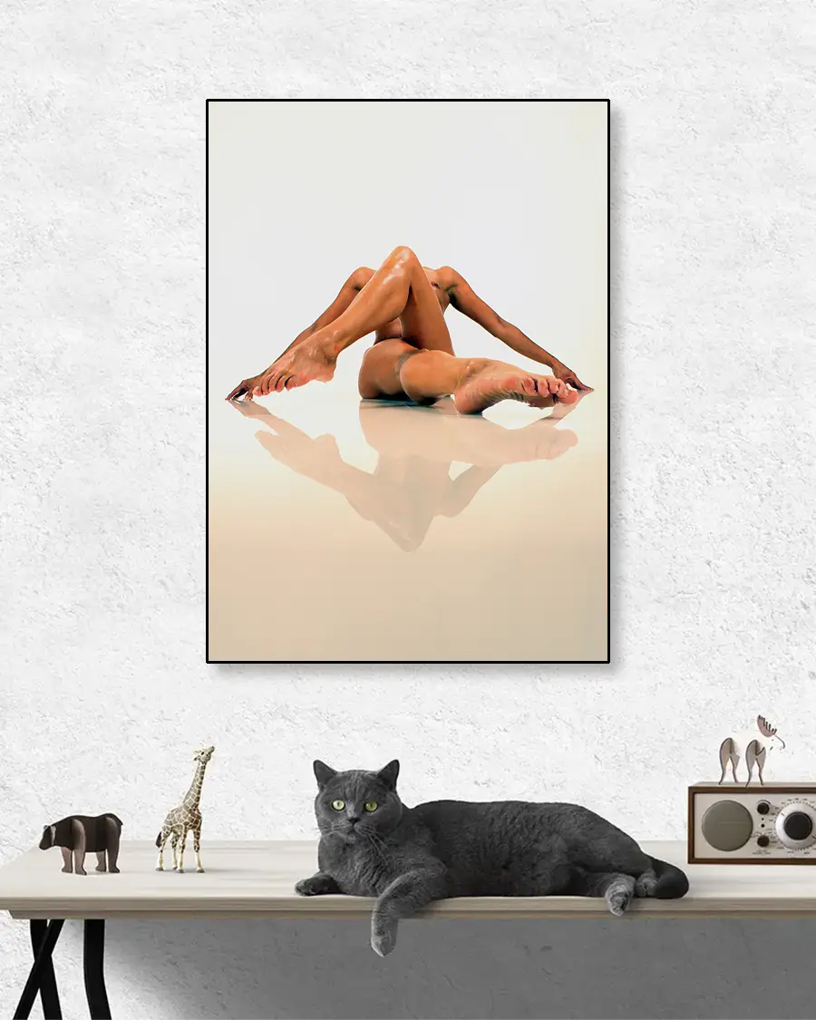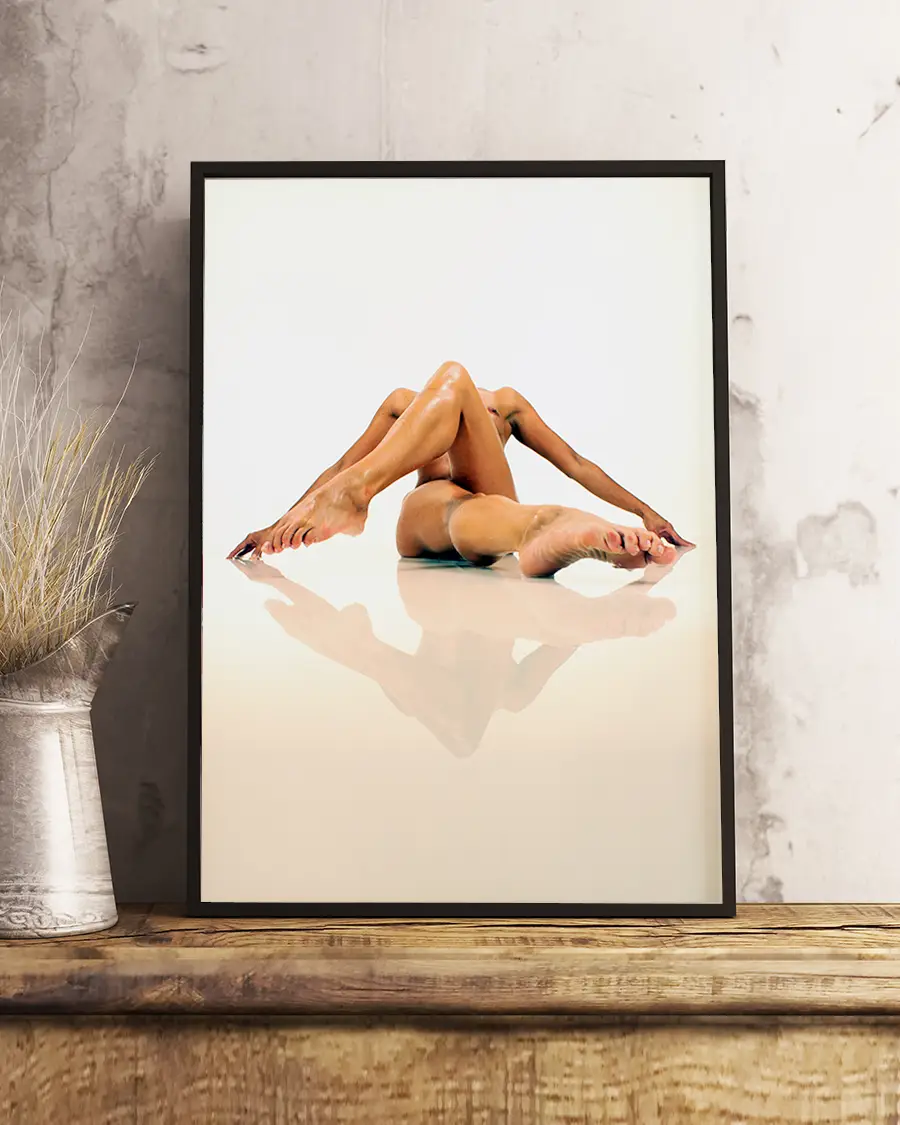 Reflecting Legs är en visuellt slående och konstnärligt balanserad poster som leker med både form och perception. I centrum möter vi en naken kvinnokropp i en akrobatisk position, där benen korsas och armarna sträcks ut i en rörelse som känns både kontrollerad och organisk. Kompositionen skapar en nästan skulptural siluett – en levande form där varje linje samspelar med nästa.