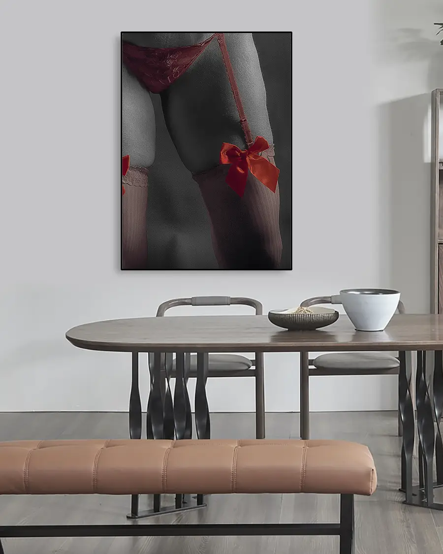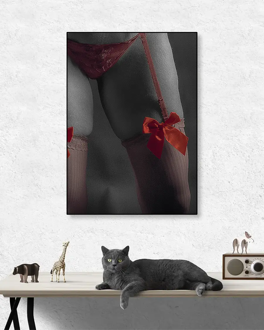 Röda Spetsstrumpor Med Rosett är ett perfekt val för dig som vill addera en sofistikerad, sensuell och konstnärlig touch till ditt hem – en poster som utstrålar både elegans och karaktär.