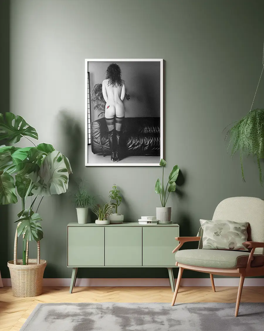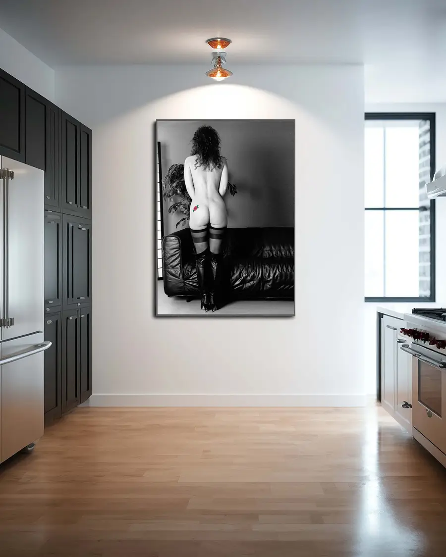 Ett svartvitt fotografi av en naken kvinna, ståendes med ryggen mot oss, med lårhöga läderstövlar. En läcker röd ros är tatuerad på hennes stjärt.