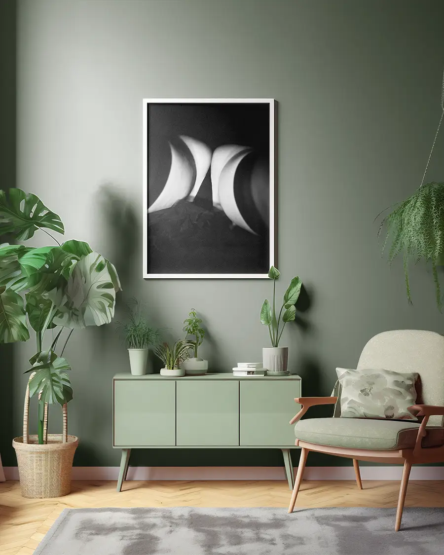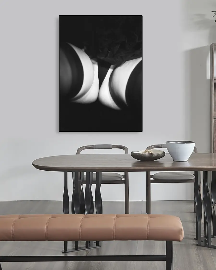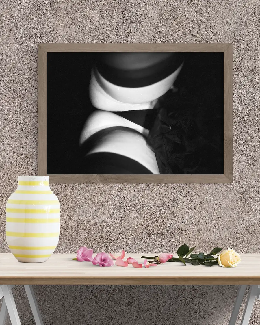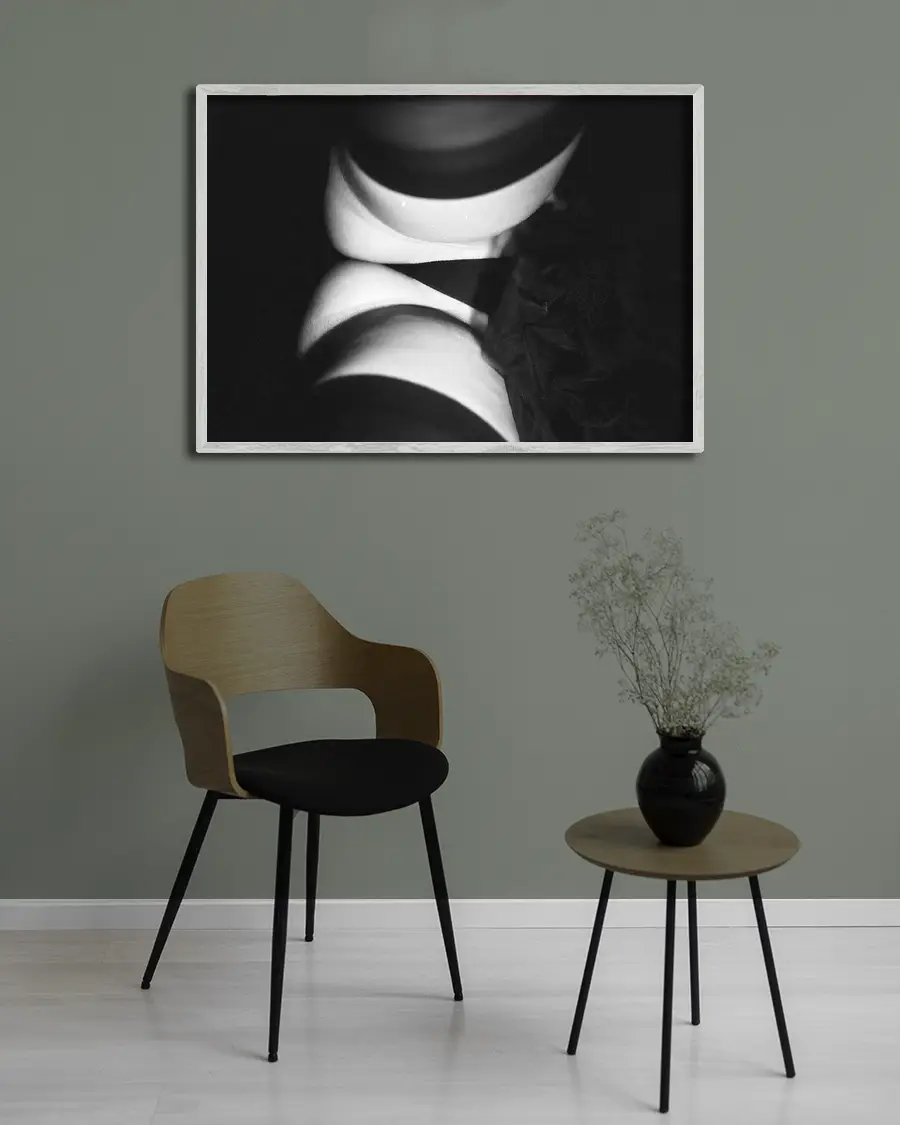 Det monokroma färgschemat ger motivet en tidlös känsla och låter betraktaren fokusera på komposition, balans och kontrast. En poster som passar dig som uppskattar modern fotografisk konst med ett uttrycksfullt och avskalat formspråk.
