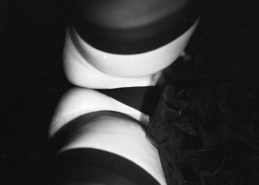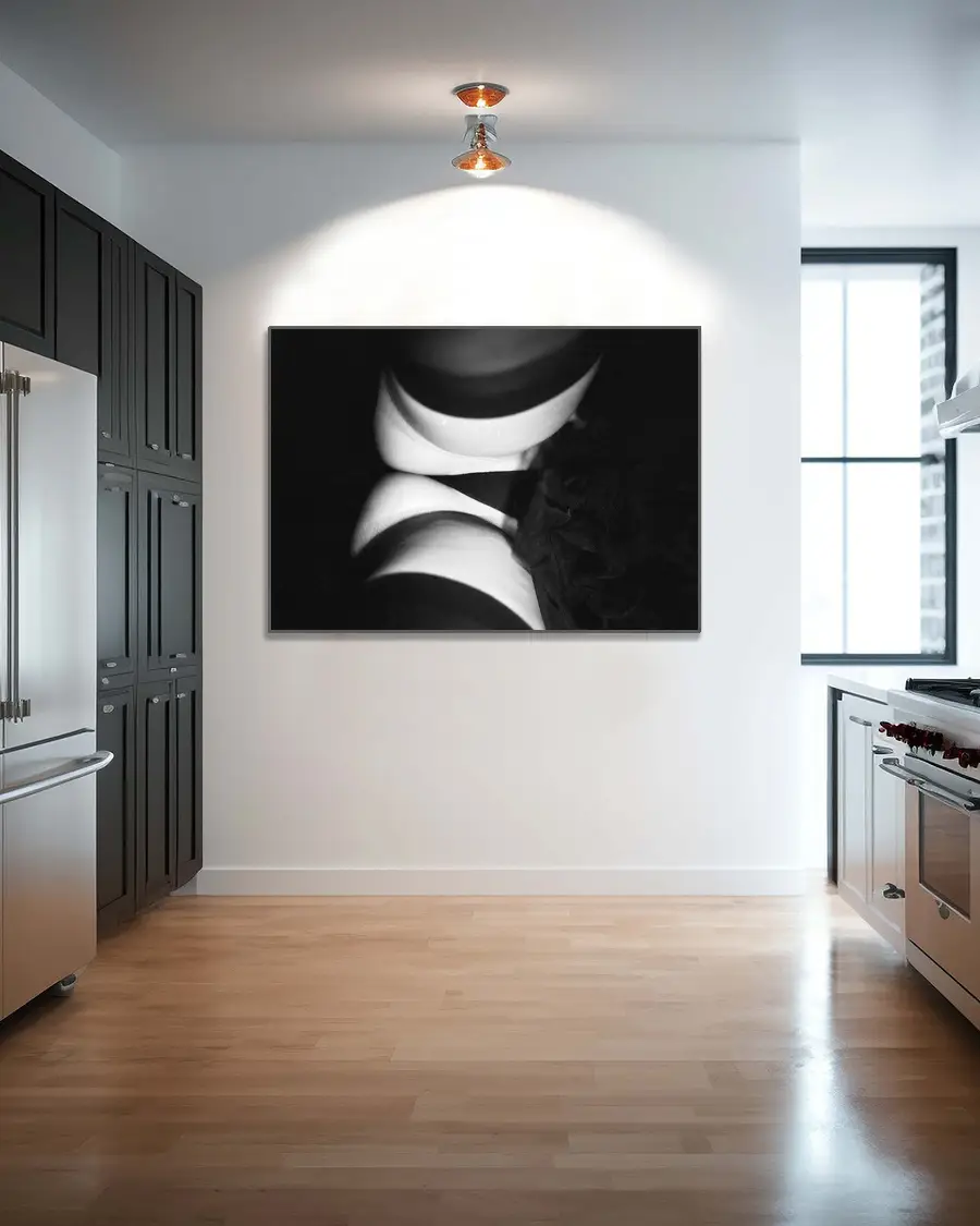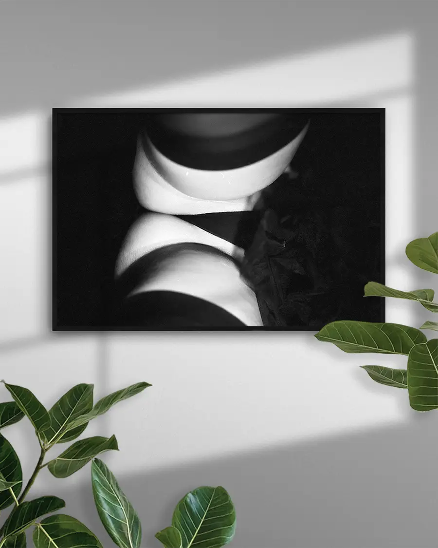 Ett konstnärligt svartvitt fotografi i fine art-tradition, där ljus, skugga och kontrast används för att framhäva former snarare än detaljer. Bilden präglas av en grafisk estetik med tydliga linjer och ett djärvt bildutsnitt som skapar ett starkt visuellt uttryck.