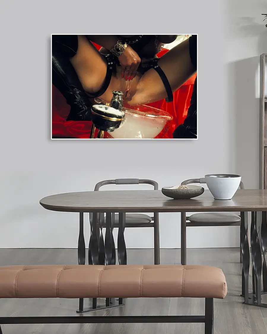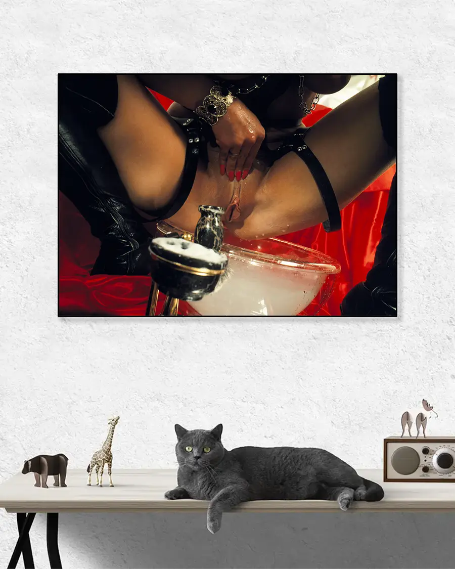 I detta fotografi möts rå sensualitet och konstnärlig precision. Kvinnan smeker sitt nyrakade kön. Klädd endast i en läder- och kedjeharness och lårhöga stövlar. Vatten droppar från hennes stjärt vid hennes svullna blygdläppar.
