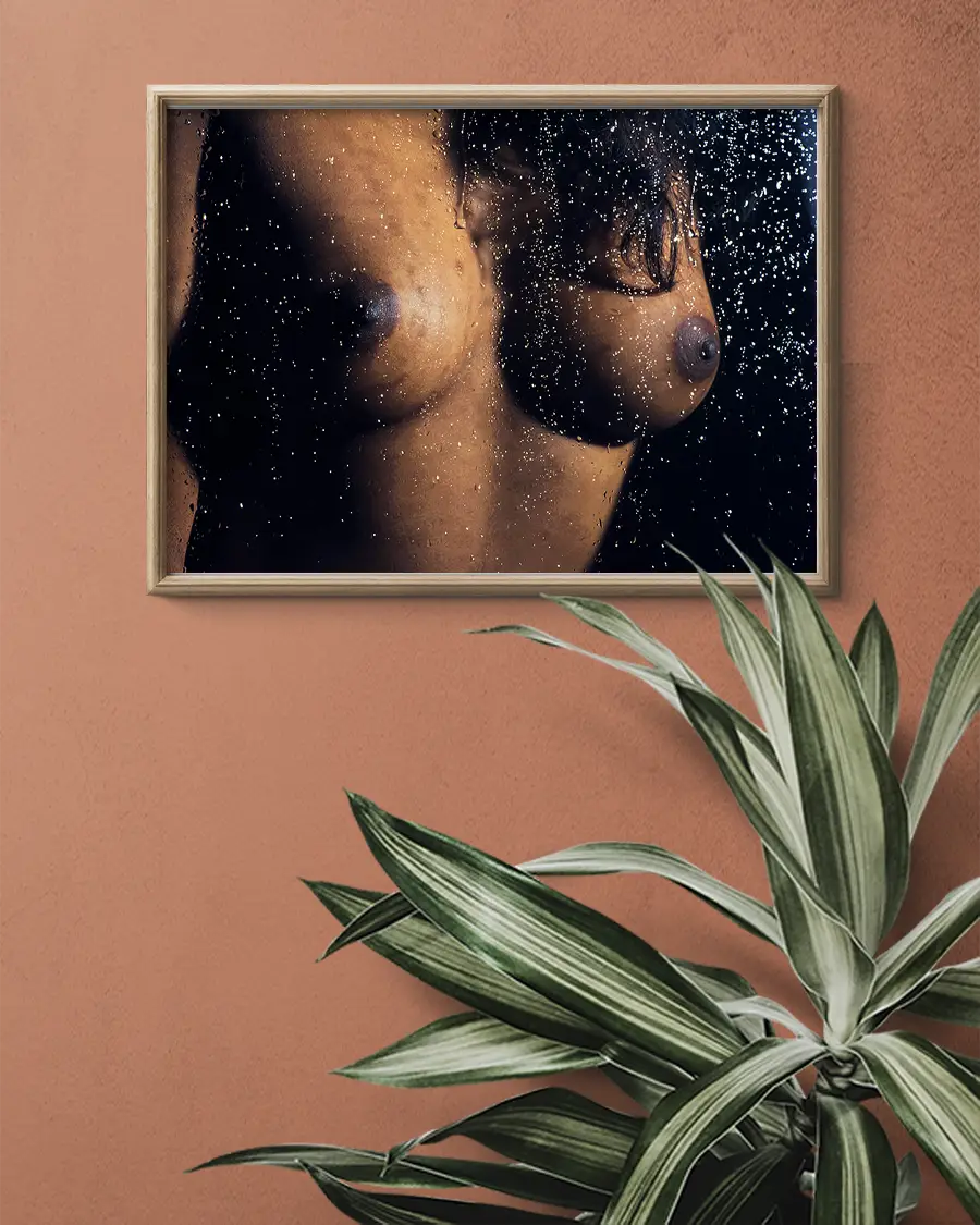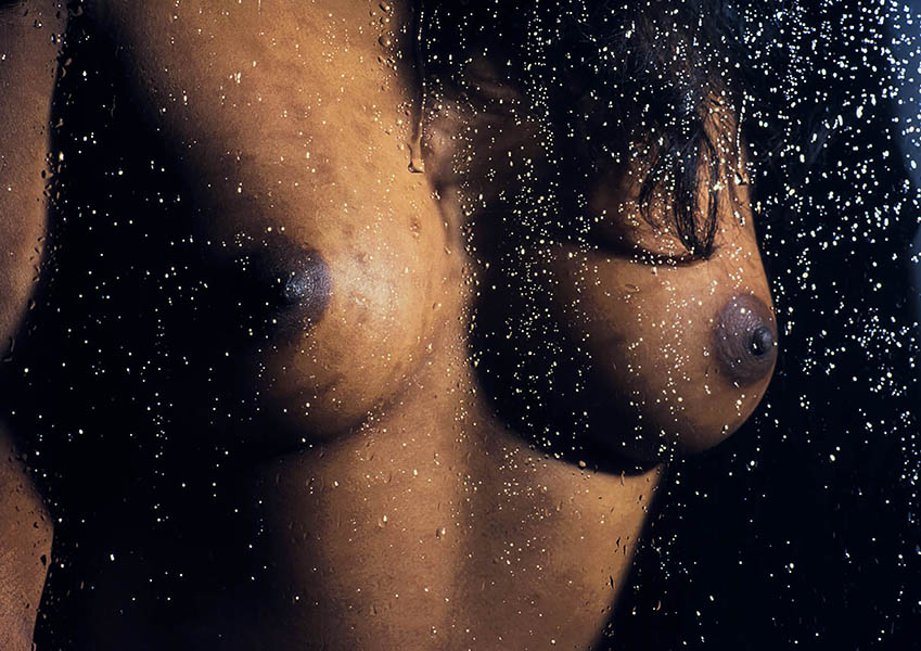 Ett stilrent och intimt fine art-fotografi där kroppen skildras på ett poetiskt och avskalat sätt. En mörk kvinnas bröst skildras genom en glasruta täckt av vattendroppar.